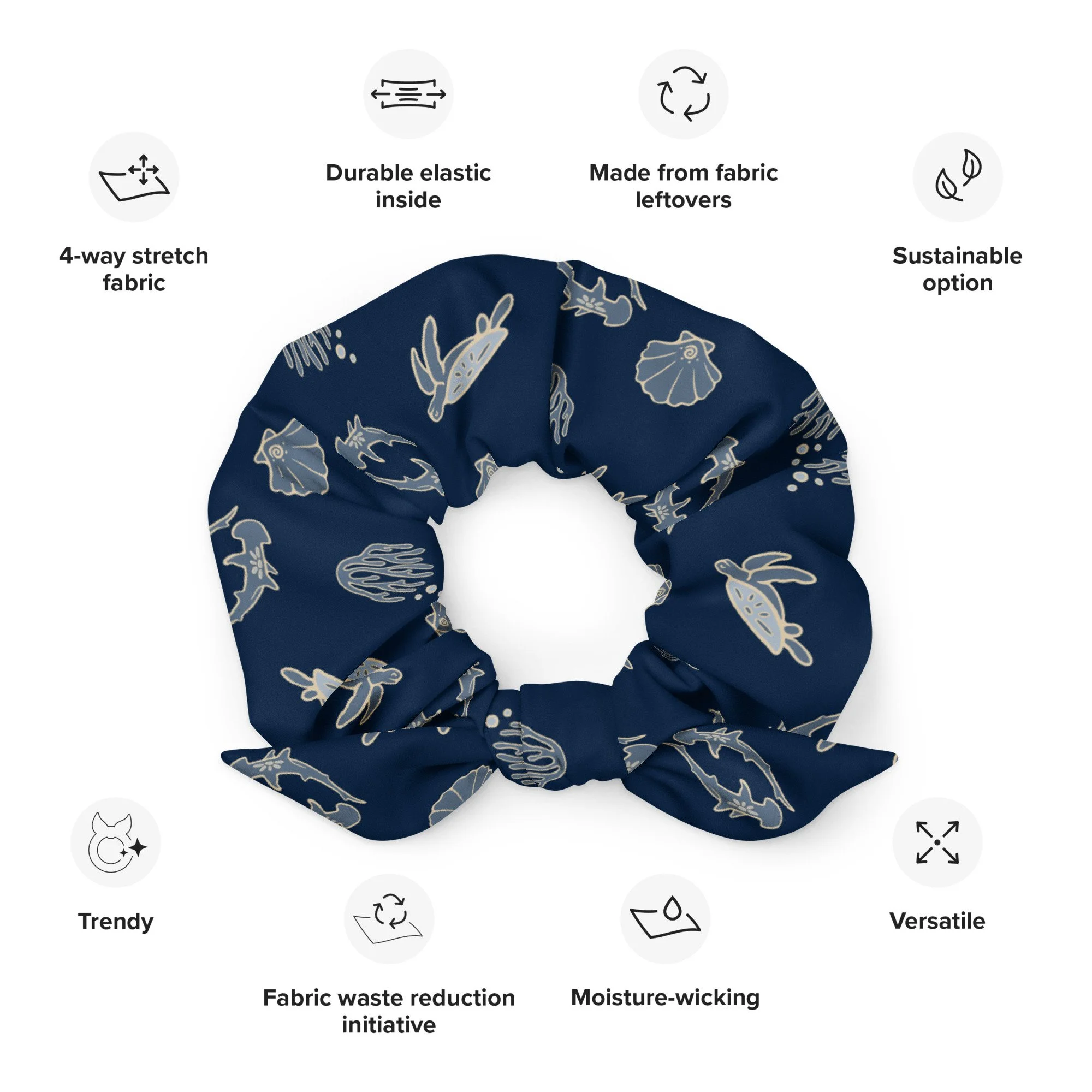 Sustainability meets style with the Crescent Scrunchie, inspired by the bonnethead shark’s crescent-shaped grace and the coastal ecosystems it calls home. Made from leftover recycled materials, this eco-conscious accessory gives new life to fabric that would otherwise go to waste — proving that even small choices can make waves for the planet. Lightweight, breathable, and fast-drying, it’s perfect for long field days, salty hair, and everything in between.